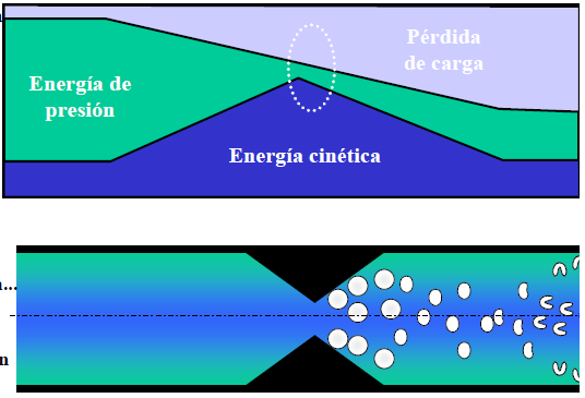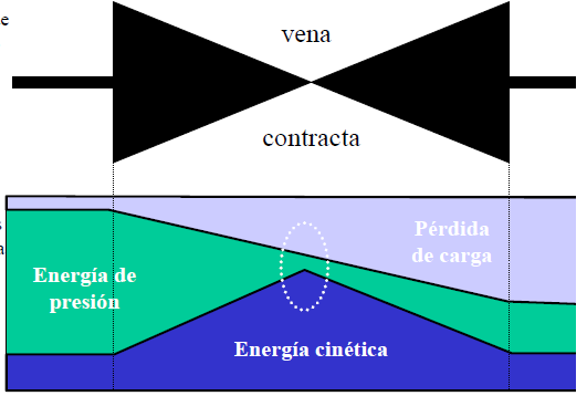 Debido al estrechamiento de la sección de paso en punto de regulación, la velocidad del fluido y por tanto su energía cinética aumentan considerablemente. Debido, también, al estrechamiento las pérdidas también aumentan de forma apreciable. En la “vena contracta“ la energía de presión restante, y por tanto la presión local, decrece considerablemente ya que la energía total debe permanecer constante.